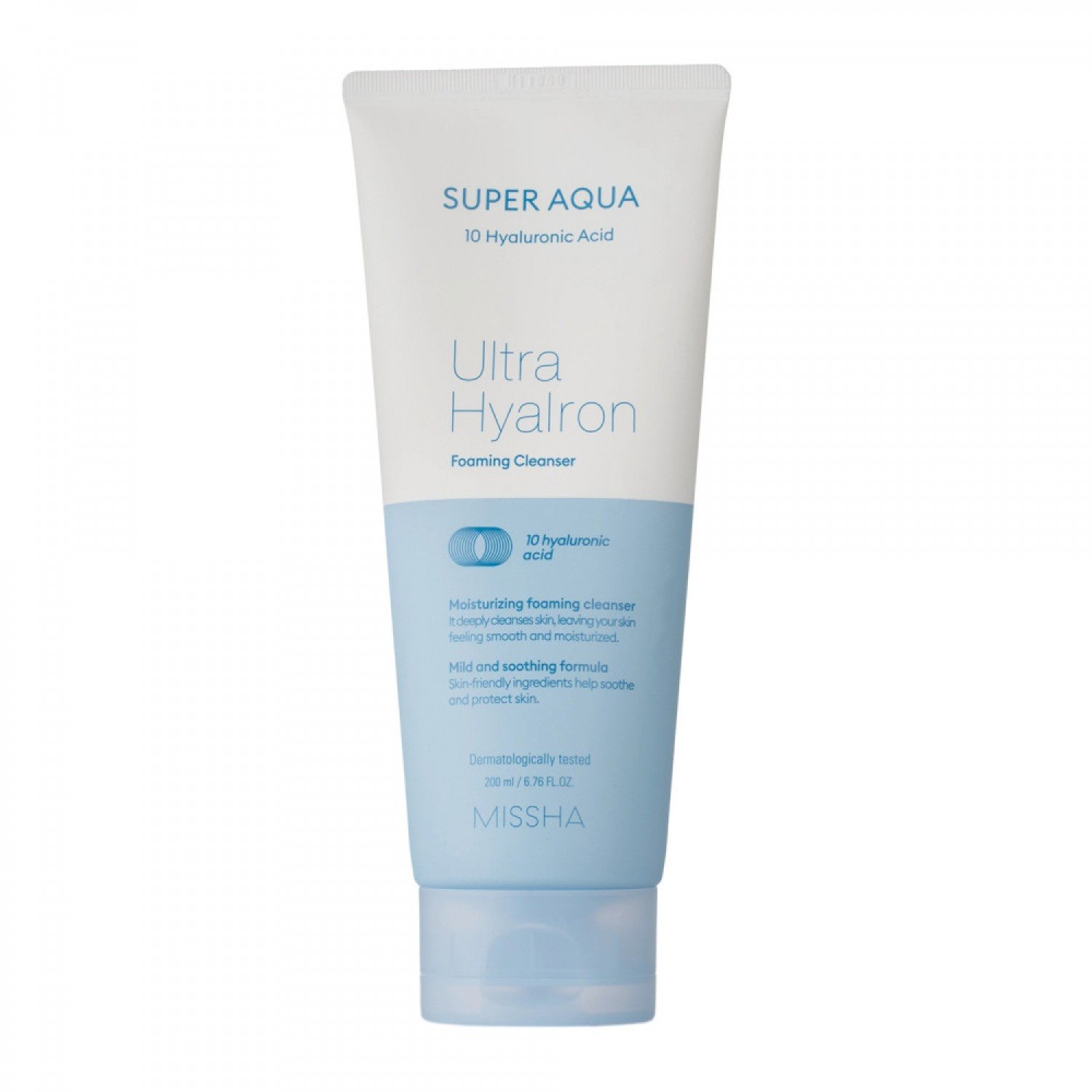 Missha - Super Aqua Ultra Hyalron Cleansing Foam - umývacia pena na tvár s hydratačným účinkom. Obsahuje komplex 10 foriem kyseliny hyalurónovej s rôznou molekulovou hmotnosťou, vďaka ktorej hĺbkovo hydratuje a eliminuje pocit suchej a napätej pokožky. Do prípravku pridaný olej z pomarančovej kôry pôsobí antioxidačne a levanduľový olej antisepticky. Produkt má konzistenciu hustej peny. Zachováva prirodzené pH pokožky a je vhodný na suchú a citlivú pleť.