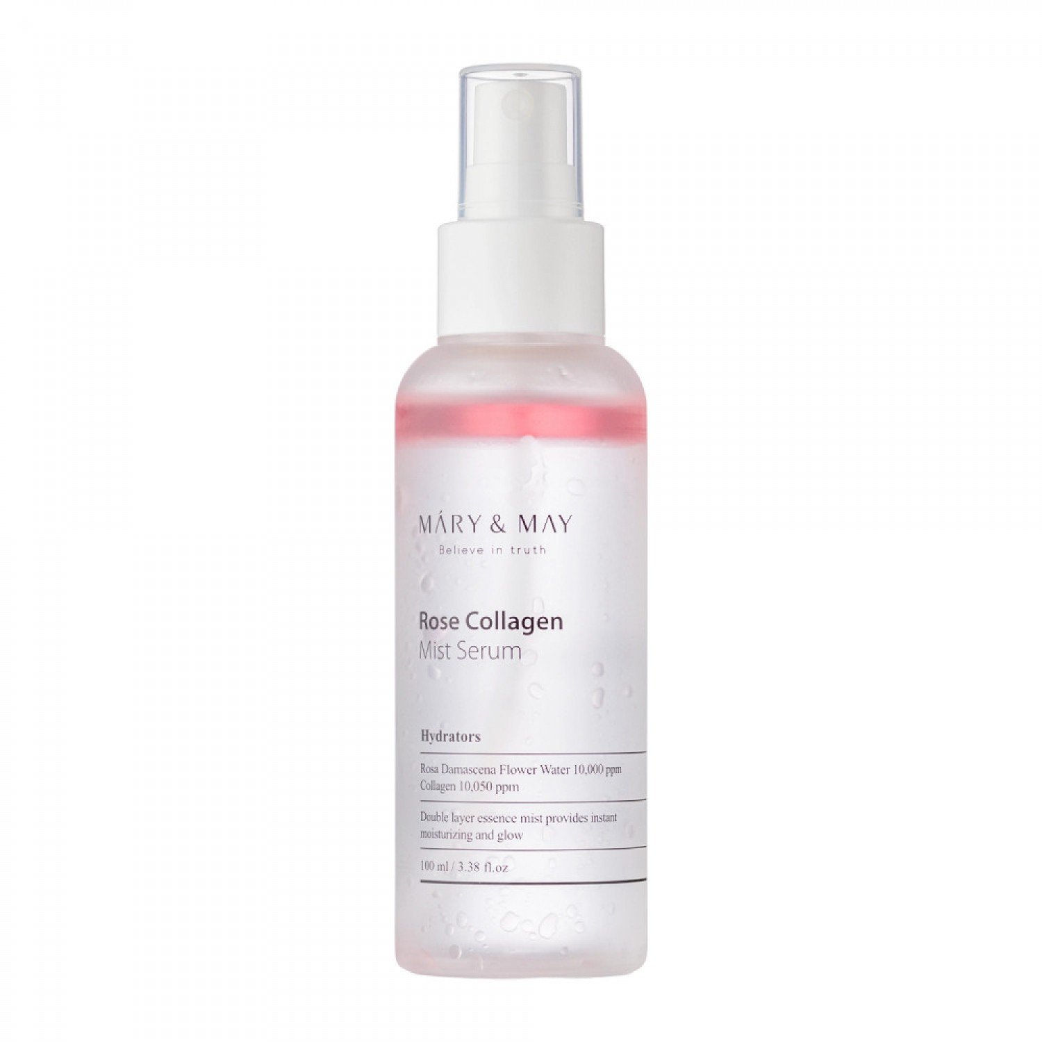 Mary&May - Rose Collagen Mist Serum - dvojfázové sérum vo forme pleťovej hmly. Obsahuje vodnatú fázu s hydratačným účinkom, olejovú fázu s vyživujúcim účinkom a pohodlný aplikátor. Prípravok na báze hydrolátu z ruže damašskej, ktorý upokojuje a bol ďalej obohatený o kolagén, ktorý vyhladzuje a zlepšuje elasticitu pleti, niacínamid, ktorý zosvetľuje pigmentové škvrny a reguluje sekréciu kožného mazu a avokádový olej, ktorý vyživuje, vyhladzuje a dopĺňa. Vegánsky, hypoalergénny produkt.