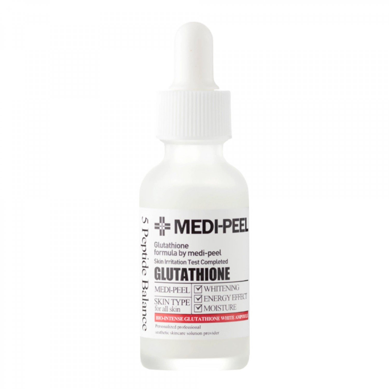Medi-Peel - Bio Intense Gluthione White Ampoule - rozjasňujúce sérum proti starnutiu tváre. Vďaka obsahu glutatiónu a niacínamidu redukuje pigmentové škvrny a zjednocuje tón pleti. Prípravok bol obohatený o peptidy, ktoré vyhladzujú vrásky a pôsobia proti starnutiu pleti.