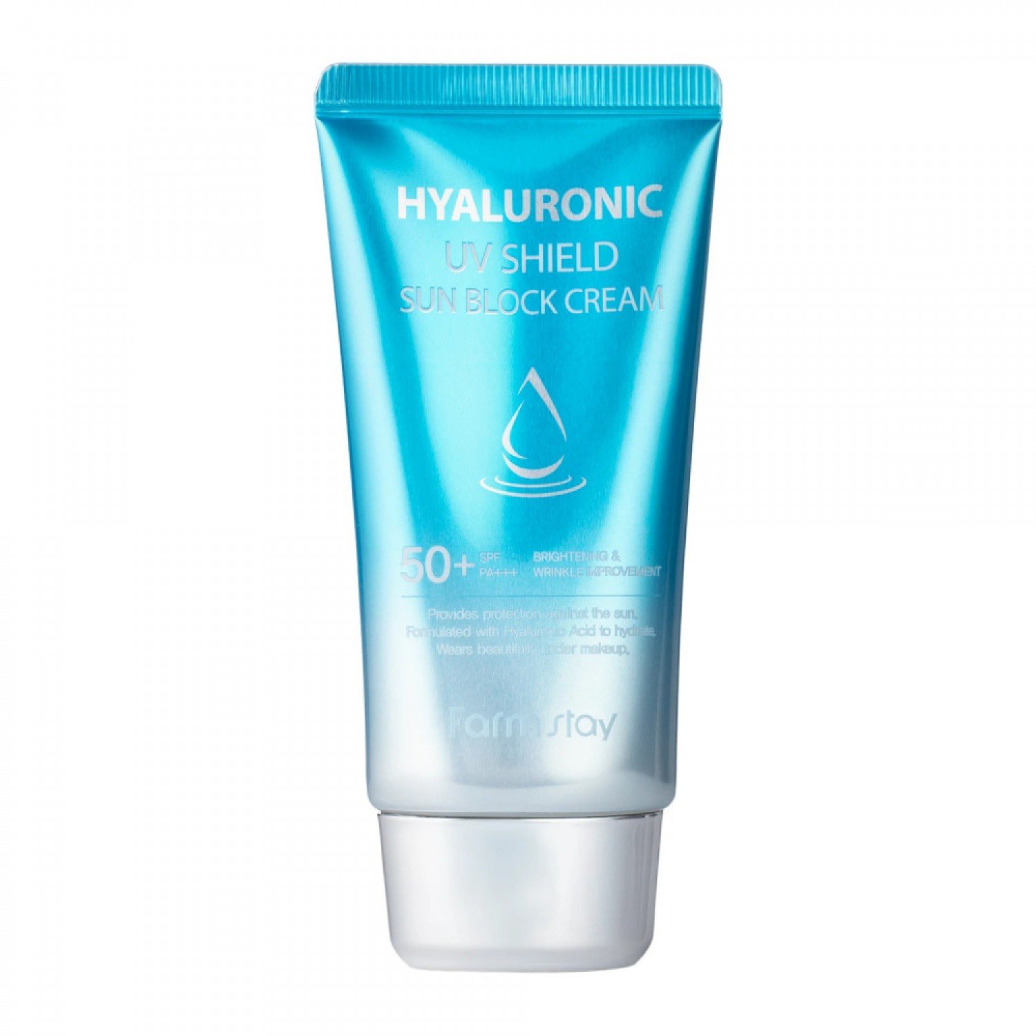 Farmstay - Hyaluronic UV Shield Sun Block Cream - krém na opaľovanie na tvár s hydratačným zložením. Obsahuje zmiešané filtre, ktoré poskytujú ochranu pred UVA a UVB žiarením na úrovni SPF50+ PA+++. Obsahuje kyselinu hyalurónovú, ktorá poskytuje pokožke hydratáciu. Prídavok adenozínu pôsobí proti vráskam a niacínamid rozjasňuje. Rastlinné extrakty vrátane extraktu zo zeleného čaju poskytujú upokojujúci účinok a chránia pred voľnými radikálmi. Prípravok sa môže používať pod make-up.