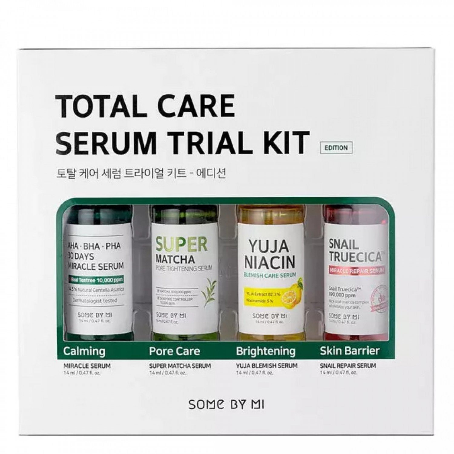 Some By Mi - Total Care Serum Trial Kit - Skúšobná sada ošetrujúcich sér - Kyselinové sérum - 14ml + Sérum so slimačím slizom - 14ml + Super Matcha sérum - 14ml + Rozjasňujúce sérum - 14ml